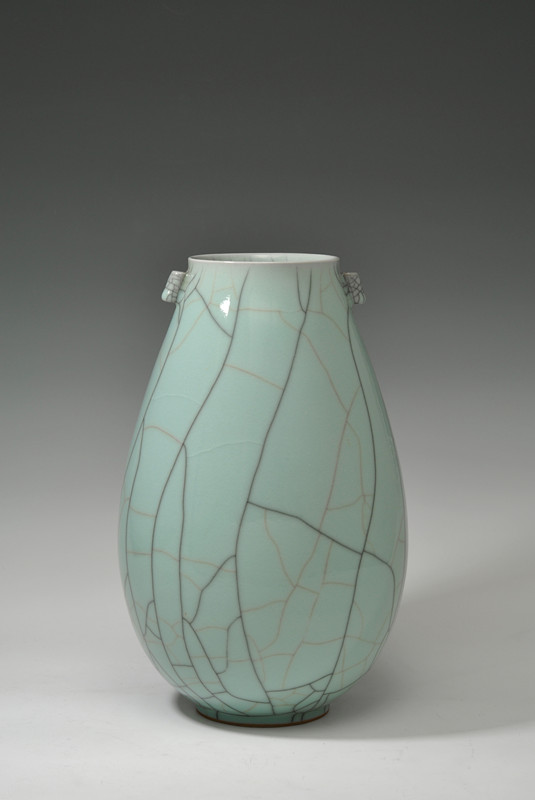 哥窑与弟窑是龙泉青瓷极具神奇地域特色的技术。陈少青创作的《哥窑梅子青刮花尊》以豆青色为主色调,釉面平润,色泽稳定,造型端庄,