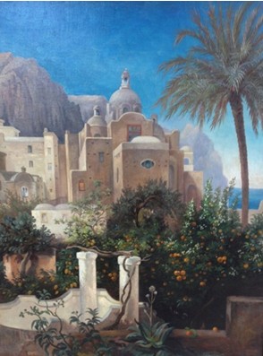 记者了解到,在前不久举办的“艺术北京”盛事,吸引了海内外不同艺术机构参展,一些海外艺术机构带来的私人藏品更是引起了藏家们的热切关注,特别是法国巴黎美爵艺术基金带来了众多珍贵的世界名画成为博览会的亮点。写《卡普里游记》的王先生正是众多艺术迷中的一名。在展览首日,王先生就第一时间赶到展会现场,急切地想体验这次艺术盛宴。王先生本身也是个旅游迷,所以偏爱风景画。当走到巴黎美爵艺术基金的展厅时,王先生看到一幅名为《卡普里》的油画,并被画中的美景深深吸引,并暗下决心一定要亲自找到画中的城堡。经了解,这幅名为《卡普里》的布面风景画出自法国画家泰奥道尔·哈克(Teodor HECK)之手,如今被巴黎美爵艺术基金所收藏。整幅风景油画作品风格兼具写实和写意之风采,画面结构章法和谐、色彩搭配别有心意,线条细腻唯美。完美展现了卡普里这座浪漫之岛的美丽风情。远处的古堡和近处的橘子树和藤蔓,低矮的白色围墙,都充满浓郁的岛屿风情。正因为这种传奇的艺术美,才让王先生发誓要找到画中风景。