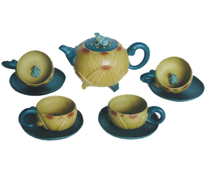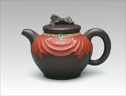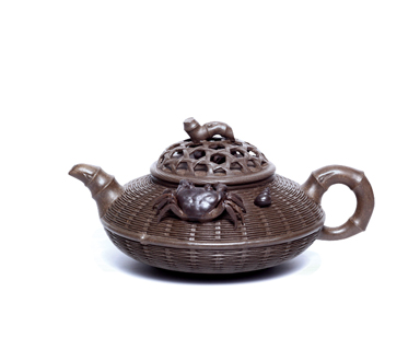 希冀思想道法的圣洁无暇,祈盼人类社会的和谐安宁是唐六琴原创题材重要主题之一。宜兴山区有非常丰富的毛竹资源,工匠们用毛竹劈成片,再剔成竹丝编成篓是唐六琴老师家乡的一项特色。这些用手工编成各式各样的竹篓,精工细作,实用还奇巧,煞是好看。深爱自己家乡的唐六琴老师觉得可以把它引申到她的紫砂作品上试试。从开始设计构图到反复推敲制作,尤其是一根根竹丝应该如何有序排列才有真实感,耗费了她差不多半年的精力,虽然历经多次失败,最后还是成功了,作品《雅竹野趣》就是:壶型似鱼篓,壶体之上爬着一只螃蟹,边上还妙趣横生地粘着一只小小的螺丝,镂空了的壶盖里一只螃蟹仿佛跃跃欲试着逃离的企图。这一把被中南海紫光阁永久收藏的壶,做工精良、线条流畅、立体感强、寓意新颖,曾荣获中国(国家级)工艺美术大师精品博览会金奖。