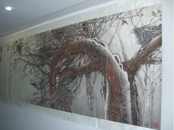 宋斌的中国画作品以乡情入画、斑斓入色,他的本次展览展出的宋斌先生精心创造的《雾凇山水》、《大树》、《中国红》、《中国蓝》、《五花山》、《咏鹅》、《小品》等系列经典作品。有竟显北国风光,千里冰封的冰天雪地、霜天无染尘的北国之美的《雾凇山水》系列作品;有大片成林,大雪覆盖而又坚强挺拔、毅力不到、枝枝向上的白桦林《大树》系列作品;有不拘泥于古法,随心而作,色彩生动、富有感染力,笔墨当随当下的《中国蓝》系列作品;有讴歌当下美好生活的《中国红》系列作品;有画面山河辽阔空远,给人以天苍苍野茫茫之感,秋染山川,尽展层林尽染之美的《五花山》系列作品;有中国文联副主席、中国美协副主席冯远先生给予高度评价 “古有羲之爱鹅,骆宾咏鹅,今乃有宋斌画鹅也!神形妙趣人皆喜之”。的《咏鹅》系列作品;有乡情浓郁,色彩斑斓艳丽,超凡脱俗,写生写真,格调高雅,独具匠心的山水画《小品》系列作品;此次展览非常全面的展示出了宋斌先生近几年来的精品力作68幅,作品《山幽尘远》,长6米,宽1.2米,以恢弘的气势描绘了北方的雾凇山水,近景松树枝干挺拔枝梢挂霜,冰雪初融溪水蜿蜒缓缓,农家小院远牧牛归来,中景云雾缭绕阶梯升腾,亭台楼阁如梦如歌飘渺虚幻,众鸟高飞空灵幽远,远景山雾飘远霜感十足。此图此情此景让人有远离红尘,远离喧嚣之感。