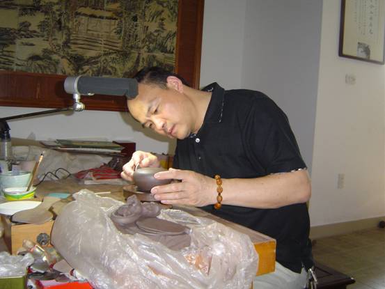 浙江长兴和江苏宜兴共同享有太湖和天目山脉的美丽富饶,共同享用着天目山脉蕴藏的极其丰富的陶土资源。几千年以来,这两地区的制陶工业都非常发达而且彼此容和互为贯通,其中最有代表的就是紫砂艺术在两地的互为传承与发展。这里将要记录的是浙江省长兴紫砂界的领军人物,目前在国内外已颇有点名气的浙江省工艺美术大师、国家级高级工艺美术师吴伟华。