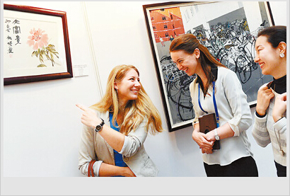 15日,俄罗斯留学生娜塔莉(左一)正在向同学介绍自己的中国画《大富贵》。