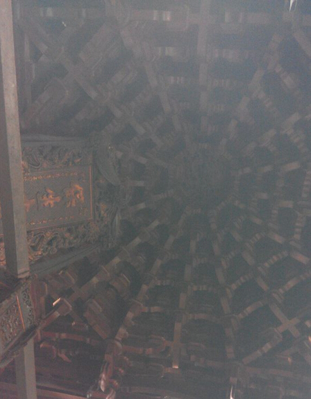 道教文化里,公庙正殿顶上修筑八卦藻井,也叫如意藻井。普通道教公庙在凿井中央刻八卦,慈济祖宫的八卦凿井中央则北雕龙南刻凤,显示了特殊的帝皇之尊。