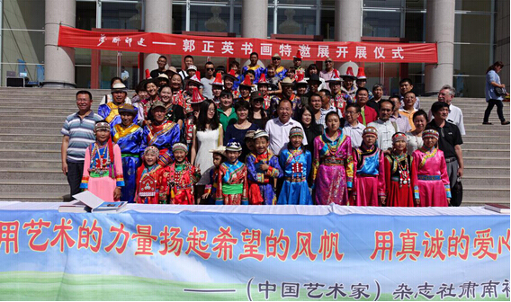 甘肃省肃南县成立于1954年,是全国唯一的裕固族自治县。现有各类学校22所,在校学生4166人,其中少数民族学生2472人,占全县学生总数的59.34%。由于该县部分乡镇自然条件恶劣,经济基础薄弱,农牧民收入低,学生家庭经济困难。如这次受支助的裕固族小学生妥存亮,家住肃南县沙漠边缘的明花乡灰泉子村,学校离家100余公里,乘车要3个多小时才能到校。家庭状况可用家涂四壁来描述,除了两间炕屋和简单生活用品别无他物,因为穷,其父45岁才结婚生子。受支助的裕固族小学生白娜,家住肃南县明花乡湖边子村,学校离家也有100余公里,为了读书,父母被迫在学校附近租房,由爷爷照顾她。小白娜家中养羊20只羊,驴10头,年收入仅七、八千元。为了帮助这些特困学生完成学业,《中国艺术家》杂志社根据甘肃省肃南县肃教发[2014]64号文件《关于请求对肃南县困难学生进行资助的请示》和文化部中国少数民族文化艺术基金会要求,决定把今年夏季的助学活动安排在肃南进行,经过一个多月的宣传发动,共征集书画作品174幅,授受社会捐赠现金51900元。经与爱心企业家联系,174幅作品全部由安徽淮南惠利集团房地产有限责任公司以10万元收购,所得善款全部用于为贫困学生购置书包、衣物、电脑等用品及发放助学金,对该县红湾小学和明花学校的学生进行支助。