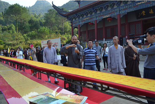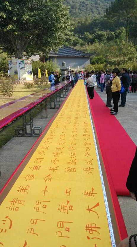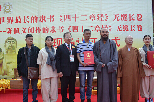10月16日,中国书法家协会会员、佛经书法名家陈佩文先生“禅林雅集”个人书法展暨陈佩文创作的隶书《四十二章经》无缝长卷世界纪录现场认证仪式在佛教丛林广东东华禅寺书法艺术院盛大揭幕,世界纪录协会高级认证官张健先生现场认证并宣布,四川省广安市陈佩文创作100.56米的隶书《四十二章经》无缝长卷创世界最长的隶书《四十二章经》无缝长卷世界纪录成功。韶关市佛教协会副会长、东华寺住持万行上师等数位高僧大德及上万信众将共同见证了这次盛会。至此,“禅林雅集”书法展暨陈佩文创作的隶书《四十二章经》无缝长卷世界纪录现场认证,经过几个月的紧张筹备终于开花结果。