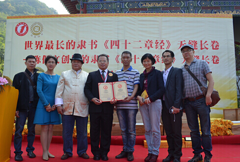 从2013年12月15日第一部隶书《金刚经》无缝长卷世界纪录诞生开始,2014年7月24日,世界最长楷书《金刚经》再次问鼎世界纪录。世界最长的隶书《四十二章经》无缝书法长卷是陈佩文先生获得的第三项世界纪录殊荣。我们有理由相信,陈佩文先生在佛教书法的成就,已是当之无愧的“中国经书第一人”。