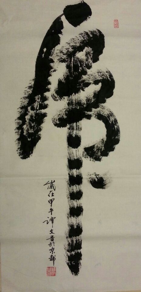 老夫走遍天南地北,悠游千山万水,不曾见过许多大书法家刽意以写“一笔虎”挥情抒怀之士何止百众之多,对榜书“虎”字的创意形形色色,各有千秋。比如:蜀中秀才广元大书家候正荣所创的栩栩如生的一笔虎,或敬赠友朋家亲、或厚赠高士政要均显高贵,一时在国内外曾闻名遐迩。候正荣大师之一笔虎凝练、厚重、劲道且笔法沉稳,真可说力透纸背,然又存古拙魏风汉味之气,依老夫拙鉴想必其中锋主笔当受广元皇泽寺一古井旁的那个力拔盖世的“神”字之启示。然象山东王大胡子的“一笔虎”,又如京都张大将军的“一笔虎”,老夫皆不以为然,老夫自创的“一笔虎”亦倍感法力不如诸众。