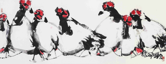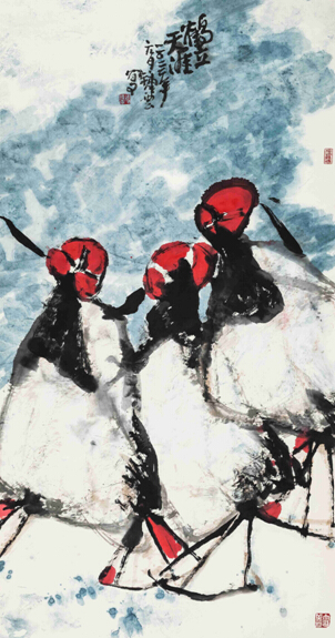 看了他的“鸟”系列,笔者想到当代艺术界的著名画家叶帅(叶永青,1958年生,四川美院教授),仿佛黑色签字笔留下心电图般紊乱的痕迹,表达一种执着和投入,童真和嬉戏,更是对传统文人画(特别是遗民朱耷)的继承和发展,这或许是“八五新潮”中的一种集体气质。但冯氏的作品不那么沉重和反叛,更多了绚烂、构成和豁达,四尺整开,或对裁斗方,矛盾有致,墨红相彰,疏可跑马,密不透风。“猫”的作品亦是如此,只见迷人的眼光,自得的神情,以及墨彩缤纷,动物灵性。