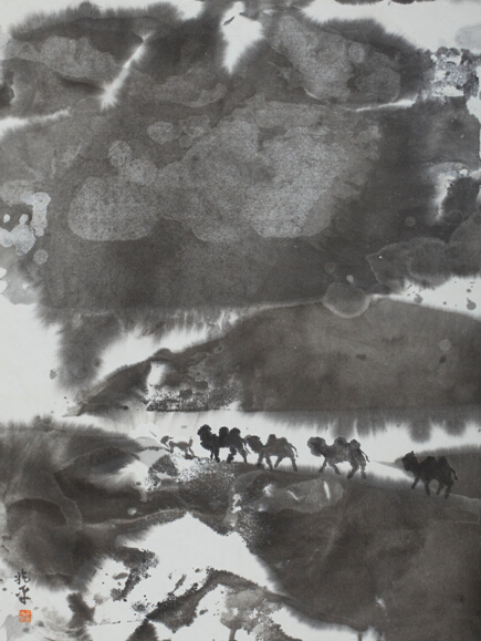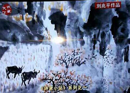 他的诗意画以水墨交融见长。中国画水晕墨章的历史,渊源流长,杜甫名句“元气淋漓障犹溼,真宰上诉天应泣”就是讴歌水墨山水的。以“外师造化,中得心源”著名的张璪,可能是画史上“玩”水墨的第一能手,有人评他的水墨画说:“高低秀丽,咫尺重深,石尖欲落,,泉噴如吼。其近也,若逼人而寒,其远也,若极天之尽。”这正是我们读刘兆平的水墨诗意画感受到的意趣和快感。