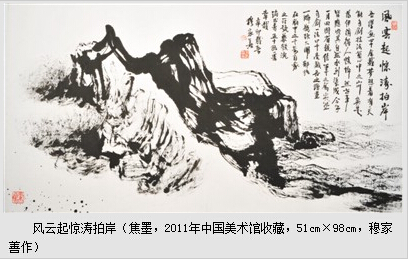 经过四十年的实践与思考,穆家善终于在焦墨山水中“立定脚根,决出生活”,把焦墨山水在建造精神家园中推向了更高的境地,这既离不开他弘扬传统文化精神的自觉,也离不开他在画内外从容修炼的心态。尽管他的焦墨山水刚刚确立,还大有丰富完善的余地,但至少提供我们两点启示:一是中国画传统的生命力远远没有穷尽,而中国艺术的写意精神,具有普世意义的宝贵精神财富,在工业化信息化社会中尤其值得重视。二是传统需要发展也必然发展,对于借古开今的画家而言,深入领会中华民族的哲思文化、诗意文化和书法文化自然是基础,而把握自由浪漫而整体的思维方式,结合当代视觉经验,以中国画语言为体,借鉴西法以丰富中国画语汇,还可以开拓出各种新的发展空间。