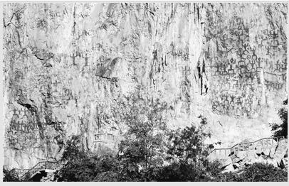 脚手架是为了调查花山高处的岩画病害,于2005年12月用竹子搭设的,高约30米。因花山岩画绘于陡峭的山崖上,平日里只能在台地上观测,高处的岩画无法细看,是这脚手架使我们与岩画有了零距离接触,开展了关于岩画的一系列病害机理分析,取得了阶段性进展。2006年8月,因为要陪上面的专家考察花山岩画,考虑到竹脚手架搭设已有一年多时间,我爬上去想做些安全检查。刚上到第一级,忽然间一窝大黄蜂从天而降。原来它们把窝安在脚手架竹筒里,我的举动惊动了它们。不计其数的黄蜂透过汗衫蛰在我背上,顿时,整个背上一阵阵刺痛,汗衫上密密麻麻的沾满了大黄蜂。我跳下脚手架,猛脱汗衫抱着头跑出岩画区,同事们闻声赶来,见状也吓呆了。他们赶忙找来村民用草药帮我猛搓,以缓解蜂的毒性,紧接着联系冲锋舟前来接应,送我到医院紧急治疗。医生告诉我,背上蛰口竟有40多处。幸好这些黄蜂毒性不大,经过诊治,有惊无险。