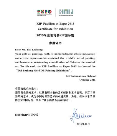 2015年10月应联合国KIP国际学院和丝绸之路文化之旅组委会邀请,在米兰世博会举办戴乐鐘黄金油画特展。黄金油画的艺术成就震撼意大利艺术界,在联合国KIP国际学院的颁奖证书中这样写道:“黄金油画艺术以其前所未有的艺术创新和艺术表现,丰富了世界绘画艺术,成为中国对世界艺术的卓越贡献。”