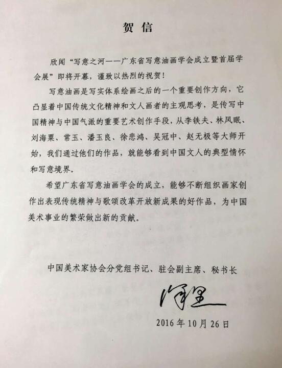 中国美术家协会分党组书记、驻会副主席、秘书长徐里发来贺电祝贺“广东省写意油画学会”成立