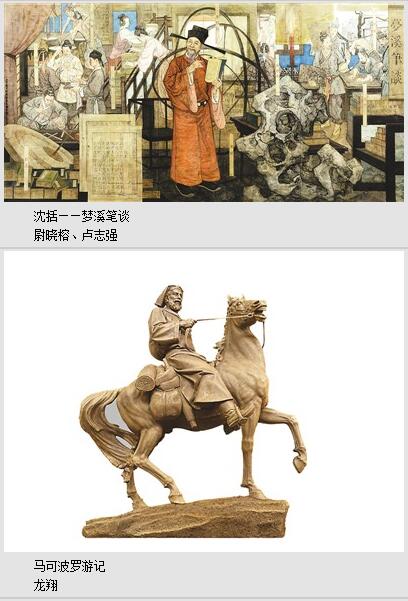 不久前,在杭州G20峰会上,人们又一次听到了马可波罗这个名字,正是他,在700年前向西方世界介绍了东方的中国、杭州。杭州中国美院教授、雕塑家龙翔创作的《马可波罗游记》,抓住了马可波罗在中国饱览山川、浸润人文后,成长为一代东西文化大使,踌躇满志地回国的场景,深邃的目光、坚毅的神态,透露出主人公丰富的内心。雕塑家对雕塑的处理既体现了传统中国雕塑概括的线感,又有西方雕塑的结构和表面,处理得细微、生动,耐人寻味。