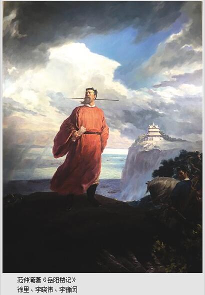 中国美协驻会副主席徐里领衔创作的油画《范仲淹著<岳阳楼记>》,突出表现了北宋政治家、文学家和军事家范仲淹,以其毕生的文人情怀和政治抱负为国为民鞠躬尽瘁死而后已、“先天下之忧而忧,后天下之乐而乐”的人物形象。徐里介绍道:北宋审美在中国历史上也达到了一个高峰,范仲淹的形象塑造要体现他文武兼修、气度非凡、品味端正、刚直不阿的精神气质。在范仲淹脸部的塑造上经历了多次的选择与推敲。在光色处理上,选择一个秋季下午近黄昏的时分,一缕暖光照射在主人公的上半身,远处还有较晴朗的天空,但是近处已是乌云笼罩,山雨欲来风满楼,风也吹动了他的衣袍和胡须。范仲淹微抬起头,微眯眼睛望向远方,扩张的胸部、手与脖子处的偾张血管也体现了他的胸怀和激情。