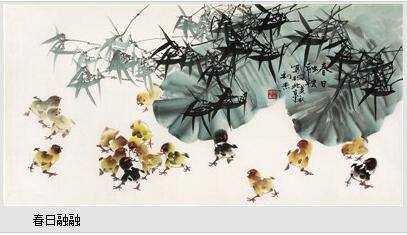 郭利杰的作品,以大写意的手法,在挥洒间让人感受到了他在创作时的沉酣忘我。他画《日出东方图》,雄鸡昂扬引吭,傲视四野,大有一唱天下白之磅礴;而他的《春色满园》,描绘了无数只鲜活的小鸡雏,或用纯墨,或用藤黄,寥寥数笔则灵动鲜活,满纸绒光,把墨与色幻化成了极精妙的物象;画《五福图》则施展他画猫之绝技,把五只小生灵画得娇姿媚态,神气充盈。在郭利杰的一幅幅作品里,色与墨之妙,情与物之趣都体现得淋漓尽致。郭利杰对传统笔墨坚守而又勇于出新,无论视觉的把握还是色彩的渲染,走笔运墨,厚重倾泻之下,充满的是文人笔墨的散淡隽永,而细节中流露出的朴拙旨趣,则彰显的是他豁达的人生态度。生活是艺术创造的灵感源泉,艺术家只有全身心的对生活去爱,对万物有情,才能创作出不朽的作品;一个优秀的艺术家除了要具备高超的技艺外,还必然要有这般心境,这般学养,这也是郭利杰绘画所传达出来的一个最根本的信息。