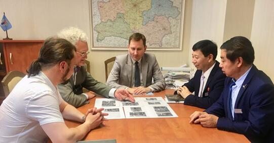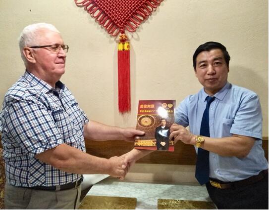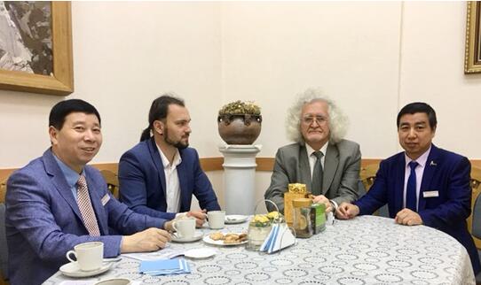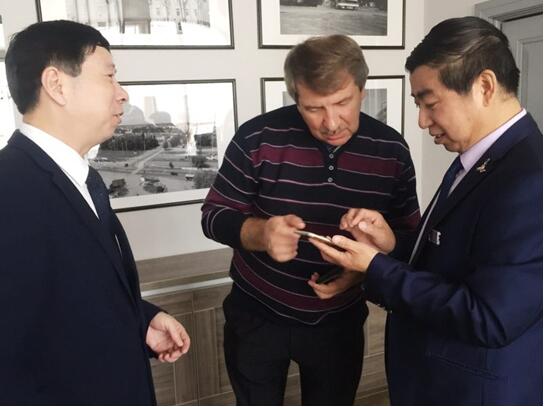 中国人民大学艺术学院书画导师、国家一级美术师户广生与俄罗斯市长、刘瀚鍇一起交流