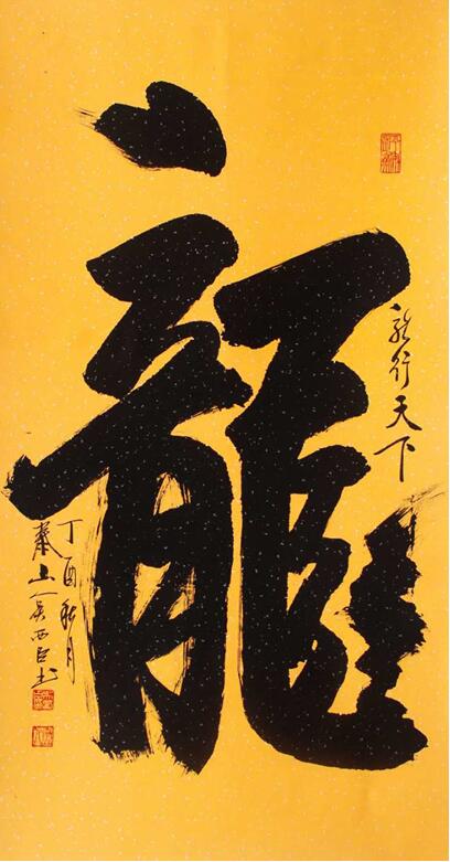 最让人服气的是,西臣先生行笔无比利落,骨力十足。书法造字,最难酿得骨力之感,心有力、身有力,身心之力能透笔管达及毫尖,才能让笔墨突现骨力,得正气足,中气盛的书法效果。显然,西臣先生在书龙时,心力、身力俱佳,以心驱笔,以意泼墨,完全是游刃有余,气势涌涌的效果。如果没有数十年的笔力修行之功,龙字绝无如此坚拔!