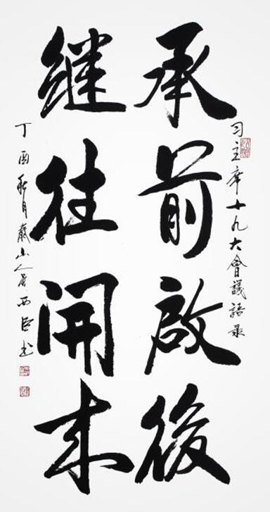 如今,西臣先生不因年高而辍艺,反倒对书法艺术有更加高远的追求,心境得乘风之力,老当益壮,创作精力不减,频制大作精品,为书艺发展尽心倾力,为文化光大振臂执旗——大家永远是大家,他始终走在时代发展的最前列!