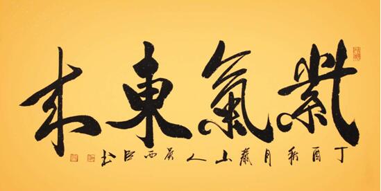 又细赏西臣先生《紫气东来》一幅,又不得不盛赞先生的笔功之能。这幅作品,楷意取自颜、欧。你看一个“东”字,首笔横画,与末笔撇捺,丰艳华美,完全是颜体端美,而折笔则取欧体之细,细构折拐,逸如轻云薄雾,美哉悠哉。一字之中融两体,可见西臣先生对古贴有精细的把握能力与强大的融合功夫。极赞首字“紫”与末字“来”,行草之形,意气贯通,形随意连,折笔纵行,行云流水,一气呵出,完具王羲之书兰亭的随心所欲与轻灵飘逸,笔法之自由,前承二王之能,又极尽自家新意,有继承,有创新,此谓横书精品,悬于堂舍,必大得紫气东来之吉意。这幅作品,有功底、有新风,有吉意,得众人追,那是必然。