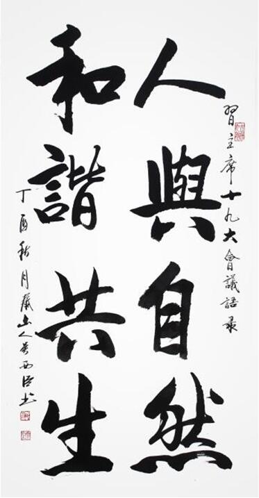 He also praised Mr. Xi Chen's "Purple spirit" and had to praise him for his pen work. This work is written in Yan and ou. You see a "East" word, the first horizontal painting, and the last brush aside, rich and gorgeous, is entirely beautiful, and the folding pen is taken from the European body of fine, detailed folding, elegant as clouds and mists, beautiful and leisurely. The combination of the two characters shows that Mr. Xichen has a fine grasp of the ancient paste and a strong integration effort. The first word "purple" and the last word "come" are highly praised. The form of the first word "purple" and the last word "come" are in line with the grass, the spirit is coherent, the shape is free to connect, the pen folded vertically, the flow of clouds and water, out of one breath, complete with Wang Xizhi's Shulan Pavilion as one pleases and light as one pleases, the free style of writing, inheritance of the two Wang's abilities, but also make full use of their own creativity, inheritance, innovation. Hanging in the hall, it will be a great aspiration. This work has the foundation of knowledge, the new style, the auspicious idea and the pursuit of people.