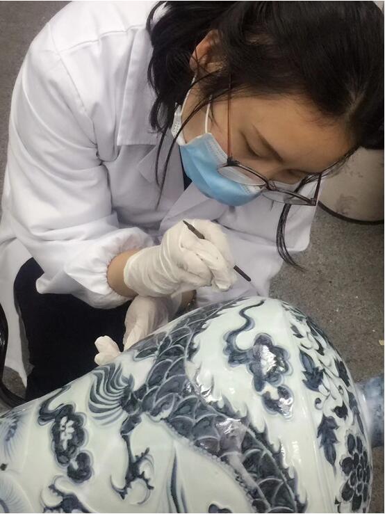 口罩、乳胶手套,白大褂“全副武装”的广州中丞艺术博物馆有限公司的文物修复师,正在小心翼翼的为一只青花龙纹梅瓶的做着纹饰修补工作,而在此之前,这只青花龙纹梅瓶因为受到外力因素,严重破损。