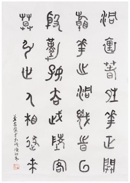 初識劉家男,是在王清州老師的畫展開幕式上,一個擁有甜美笑容的女孩,跟隨王清州研習書法、繪畫。通過聊天得知她現就讀於北京城市學院環境藝術的研究生,但是內心對中國傳統藝術的熱愛,讓她走上了書畫創作這一條藝術之路。劉家男的創作範圍比較廣,書法上:篆書、行書、隸書、草書、簡牘等均有涉獵;繪畫上:有半工半寫的純水墨梅蘭竹菊,抽象系列有濃烈的潑彩重彩和探索創新的綜合材料。多元的創作範圍和豐富的創作手段,加上劉家男自身的敏而好學,使得她的藝術之路頗為平坦。