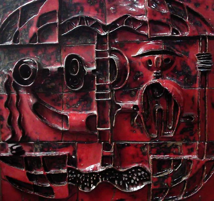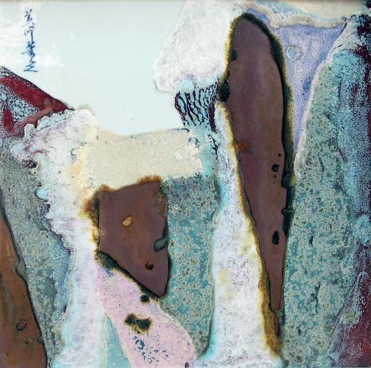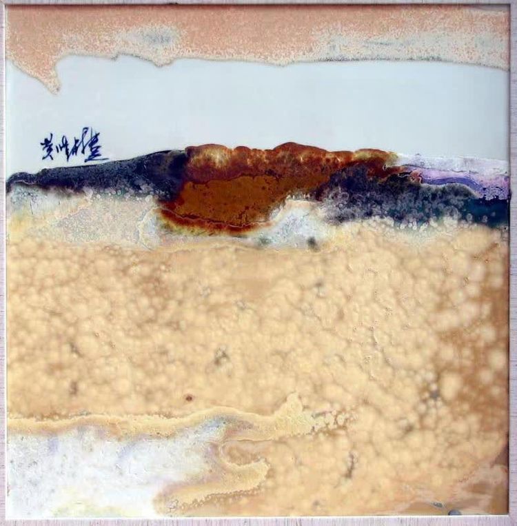 二、“陶瓷壁画”系列--陶瓷版画彩绘作品,是他最具代表性的作品。他以后现代绘画意识结合传统釉下彩工艺技能,使得每幅作品处处彰显它传统的东方神韵,同时又表现它抽象艺术中一种无法明言、不可名状的动力,油然地发自内心的情感和想象,不自觉地组合成创造的意象,这也是他在其《高浮雕陶壁画》《陶版画》《颜色釉壁画》和《瓷盘彩绘》为主的装饰性创作中,尤为突出的表现。其陶版绘画之作颇有诗情画意之类。