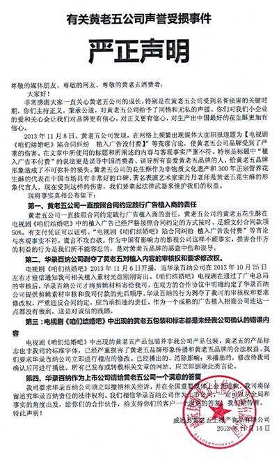 黄老五董事长表示:黄老五公司一向非常重视品牌建设,此次与华录百纳的合作正是看中了对方强大的影视剧操作运营能力,本想利用此次广告赞助植入机会,扩大黄老五的品牌影响力,为2014年开拓全国市场打下群众基础,没想到对方在却一而再再而三的出现违约行为。