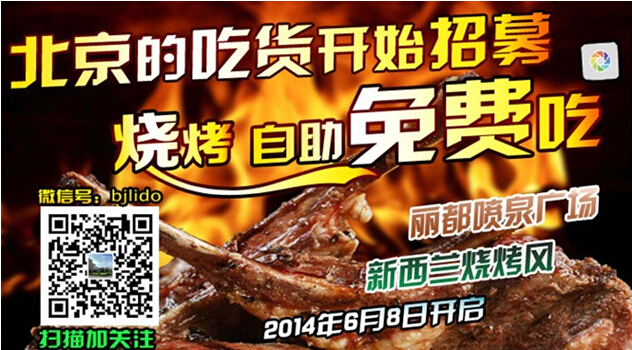 快动动手指,关注“北京丽都维景酒店”官方微信(微信号:bjlido),并把此活动分享到您的朋友圈,即可有机会免费抽取丽都喷泉广场新西兰烧烤免费自助餐券(共5张)或免费烤鸡券(共25张)