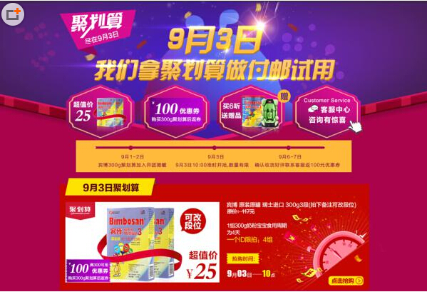 Bimbosan宾博已在瑞士和欧洲市场活跃了82年,已经成为欧洲家庭的常客。宾博在2013年进入了中国市场,官方旗舰店也同期上线,并且拥有非常不俗的销售成绩。不过宾博奶粉可是甚少参与聚划算这类的活动,要么不参与、要么一鸣惊人,9月3日,Bimbosan宾博将以最大的诚意邀请新老顾客的光临!