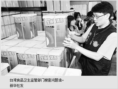 所谓馊水油,就是之前在大陆成过街老鼠的“地沟油”。9月4日,台湾警方通报,经查发现郭姓涉案嫌疑人经营地下油厂,用回收馊水油和皮脂油等混制食用油,强冠公司则以低于市价的价格购进并制成“全统香猪油”上市贩售。台食品药品监管单位查明,强冠公司今年2月至8月间共出产劣质猪油782吨。截至7日下午2时,该单位与各县市卫生局总计稽查食品工厂、夜市、摊贩、供饮食场所等5797家次,查明购买强冠公司劣质猪油的下游业者总计971家,已封存油品数量142.1吨,对136项相关制成品下架封存回收216.4吨。其中流向的下游厂商中,以台北市、屏东县最多,而食品卫生监管部门也怀疑,强冠的厂设在高雄,高雄却仅有3家下游业者,“剩下流向不明的可能都在南部”。