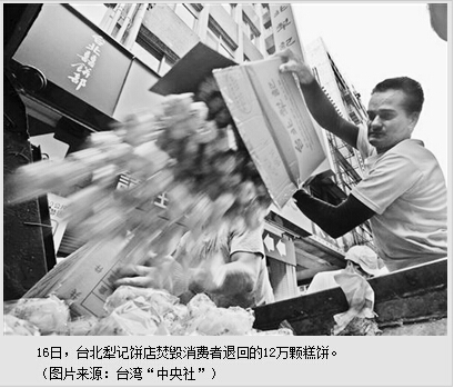 16日,台北的百年饼店犁记焚毁了消费者退回的12万颗糕饼。犁记发言人称,退货金额将近新台币4000万元。