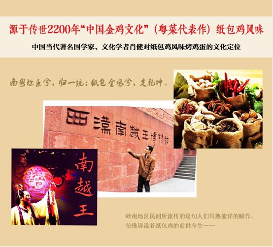 说起纸包鸡风味烤鸡蛋的渊源流变过程,不得不提及享誉海内外、流光溢彩的传世2200年“中国金鸡文化”(粤菜代表作)、中国味道、中国传统节庆第一道菜、广府中秋节庆三大美食、中华美食三大名鸡、广府美食三大名鸡、广西三宝、梧州四宝、桂林情结,中国名菜、中国十佳金鸡、广西非物质文化遗产、广西特产行销全国核心品牌、广西最具特色餐饮品牌纸包鸡,甚至可以将纸包鸡理解为纸包鸡风味烤鸡蛋的滥觞。薄如蝉翼的玉扣纸、农家山地散养的三黄鸡、幽深醇厚的秘制卤汁,逐一陈列于案面之上,瞬时间,空气中弥漫着天地融和、原汁原味的诱人芳香!一切经已准备就绪,粤菜厨艺大师们开始运用巧妙的刀工,游刃有余地将三黄鸡切成一件一件,接着勺来秘制卤汁,配以老抽酱油、白酒、枸杞、姜汁、桂皮、八角、茴香、陈皮、草果、红谷米、古月粉等调味料腌制鸡肉,随后,铺开玉扣纸且用手抚平,再将鸡肉置于玉扣纸之上、撒些葱白粒,松紧得度地包裹起来。就这样,一份份如信封形状的纸包鸡包好了,造型优美、叠叠有致。将纸包鸡放入锅中,以花生油隔纸浸炸,片刻的功夫,热气腾腾的纸包鸡终于端上餐桌,一股浓浓的南粤气息扑面而来,轻轻地撕开玉扣纸,金光灿灿的纸包鸡奇妙地飘出了竹子那渗人心脾的缕缕清香,这是以新鲜的嫩竹和清澈的山泉水所制成的玉扣纸独有的香气,缓缓地放入口中,鸡肉鲜嫩甘滑、鸡味浓郁、醇厚不腻……细品一下纸包鸡的历史文化,可以用“博大精深、源远流长”这8个字来形容。“南粤称臣兮,归一统;纸包金鸡兮,定乾坤。”岭南地区(两广地区)民间所流传的这句人们耳熟能详的赋作,仿佛诉说着纸包鸡的前世今生……据考证,在我国,自古以来就有“无鸡不成宴”的习俗和讲究,集中、真实地体现了中国传统饮食文化理念和社会风俗习惯,鸡菜肴堪称中国传统节庆第一道菜,同时又是人们一日三餐的主要菜肴,纸包鸡堪称鸡菜肴中的代表作,古有南越王、汉高祖、苍梧王、唐明皇、杨贵妃、苏轼、明太祖、靖江王、康有为,今有孙中山、陈济棠、白崇禧、徐悲鸿、秦牧、史玉柱等名人,都曾在纸包鸡的史册上留下足迹,为它增添了丰富的传奇色彩!纸包鸡作为宫廷贡品和日常主菜的历史至少已有2200年,始创于岭南地区,相传,公元前203年,赵佗自号南越武帝,建立南越国,定都番禺(今广州),当时的南越王宴就是以纸包鸡作为主菜的。公元前202年,刘邦称帝,史称汉高祖,建立西汉王朝,定都长安(今陕西西安)。及后,赵佗以纸包鸡作为贡品献与刘邦,上表臣属西汉,刘邦品尝了纸包鸡之后龙颜大悦,诏封赵佗为南越王,至此天下归于大一统。