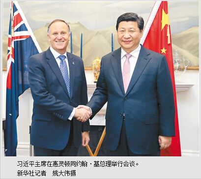 约翰·基表示,新方致力于同中方一道建设好两国全面战略伙伴关系,在中方核心利益和重大关切问题上,新方将继续支持中方。新中签署自由贸易协定6年来,两国合作取得丰硕成果,新形势下,要提高双边贸易投资水平。新方希望扩大新西兰农产品、乳制品对华出口,欢迎中国企业前来投资。新方重视亚洲基础设施投资银行的作用,将积极参与银行建设。新方将简化签证手续,欢迎更多中国公民前来旅游、留学。我祝贺中方成功举办了亚太经合组织领导人非正式会议,愿意同中方一道,推动区域一体化进程,促进亚太地区和平与繁荣。