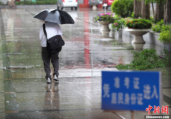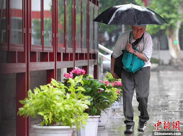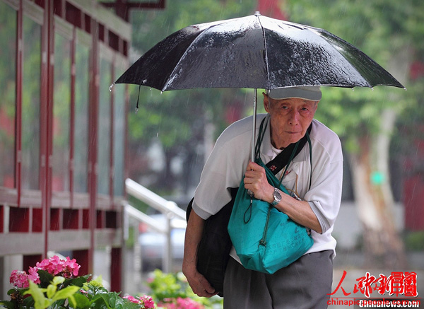 6月7日,2013年全国统一高考拉开序幕,南京84岁的考生汪侠第13次参加高考,据考场一位工作人员透露,汪侠早晨因为迟到而错过了语文考试,后来在学校一间办公室休息,不过他将继续参加下午的数学考试。自2001年高考打破年龄限制以来,当年72岁的南京市民汪侠为圆他的大学梦开始参加高考,此后连续12年参加高考,每次都铩羽而归。图为汪侠撑着雨伞从考场走出。