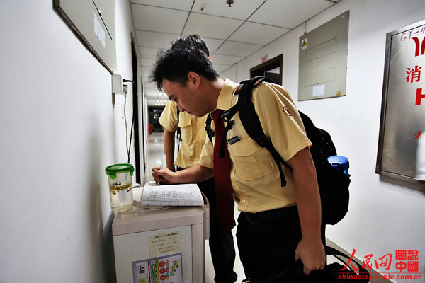 四点半,谭海涛和其他司机们一起在司机 手 册上写着每日行车注意事项以及行车预 想(主要是自己预想一些可能 突 发的状况及应对措施)。 |