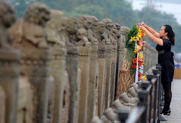7月7日,参加活动的青年党员和团员在卢沟桥上摆放花篮。