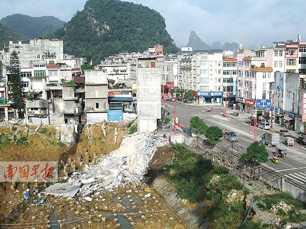 8月26日上午11时40分,位于百色市德保县城德政路的一栋4层半高的民房,历经数月的缓慢倾斜后,最终还是倒塌了。当地相关部门认为,该民房倒塌的主要原因,是由于民房后面正在新建楼盘的开发商施工队伍施工不当,导致民房地基受损所致。目前,就补偿问题双方还在协商