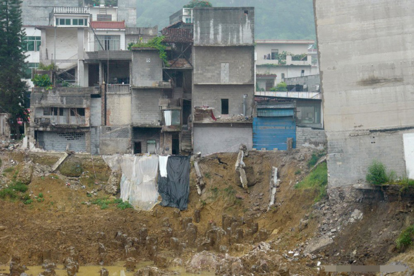 8月27日上午,记者在德保县德政路与南隆路交界口处看到,开放商楼盘地基处的左上方一片残垣断壁,其中还有一些来不及搬离的柜子、空调等物品的残骸。从高处看,还能清楚地看到这栋倒塌民房的整体结构。