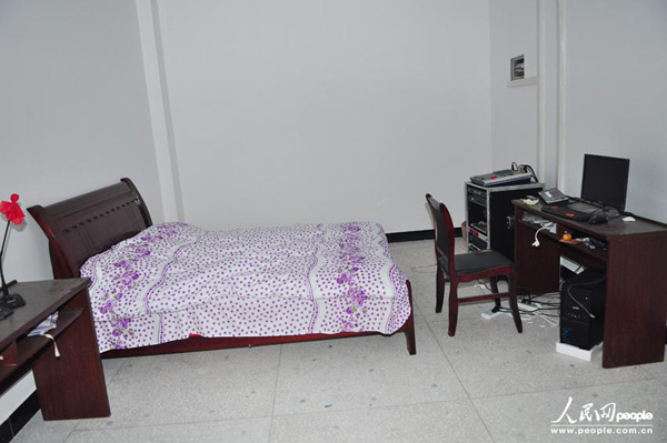 而在会议室也有一个“值班室”,记者透过窗户看到,“值班室”内除了电脑桌椅外,还配有一张双人床,床上已经铺好了被子。