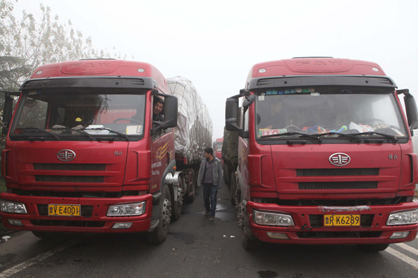 11月3日,车辆在长深高速江苏赣榆入口处排起“长龙”,一名司机在驾驶室等待雾散放行。新华社发(司伟 摄)