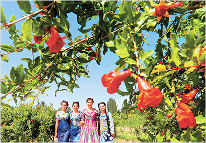 6月9日,4名身穿节日盛装的女子在盛开的石榴花旁拍照留影。当日,以“石榴花开唱叶城”为主题的新疆喀什叶城县第八届石榴花节在叶城县伯西热克乡开幕。叶城县伯西热克乡是远近闻名的水果之乡,是叶城大籽甜石榴的主产区。