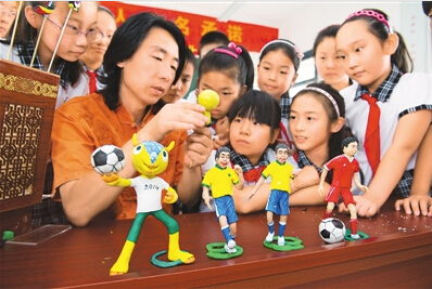 6月18日,世界杯激战正酣,合肥市面塑非遗传承人武建付来到合肥市常胜小学,手把手教孩子们制作球员面偶、世界杯吉祥物等世界杯元素的面塑作品,让孩子们在“零距离”感受中国传统非遗文化魅力的同时,享受足球运动带来的激情与快乐。图为武建付正在教学生们用面做“大力神杯”。