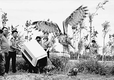 河北沧州野生动物救护中心近日举行野外放归活动,环保志愿者将36只国家二级保护动物——雕鸮、纵纹腹小鸮、红隼送到适生区放飞。