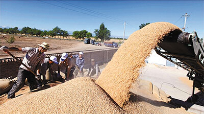 昌吉回族自治州是新疆小麦主产区,今年总产较上年增加4.5万吨左右。新疆夏粮收购7月以来全面展开。图为8月3日,新疆昌粮集团奇台国家粮食储备库大庄子粮站,农民正在交售小麦。