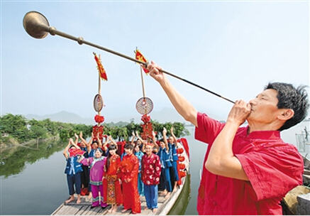 8月24日,浙江省建德市梅城镇三江口村渔民在新安江上举行“九姓渔民水上婚礼”展示活动,通过渔盆抬新娘、说规矩、喂离娘饭、唱离娘歌等环节,再现当地渔民特有的古代婚俗。