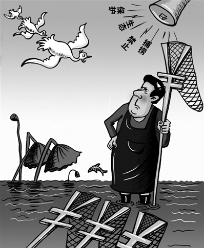 据报道,位于湖南省东洞庭湖国家级自然保护区内的采桑湖,原是“候鸟天堂”,如今却被当地镇政府以每年370万元的价格出租,沦为一片蟹池藕塘。事实上,采桑湖被划为“实验区”,也只是允许“适度开发”,但承包商挖藕养蟹的行为,已危害到当地的生态平衡,超出了“适度”范围。