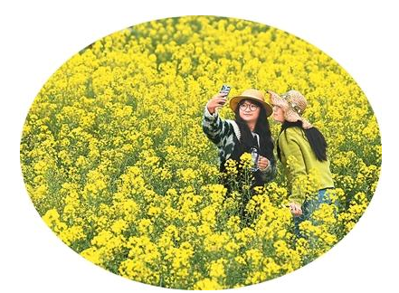 游客在四川省南充市蓬安县睦坝镇武胜村油菜花田里赏花游玩。