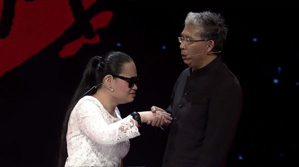 正当场上的气氛令观众飙泪之际,不想,王颖却来了个惊天大逆转,开口说起了相声。原来这位爱心盲女来自相声之乡,她认为讲历史的纪连海老师声音幽默,最适合说相声。纪老师为了满足他的心愿,走上台为她即兴捧哏,不仅如此,王颖还让纪连海扮起了老鼠,喊了两声“兄弟”后,纪老师才反应过来,赶忙应声,逗得观众前仰后合,这位盲女用她的乐观幽默再一次感染了大家。
